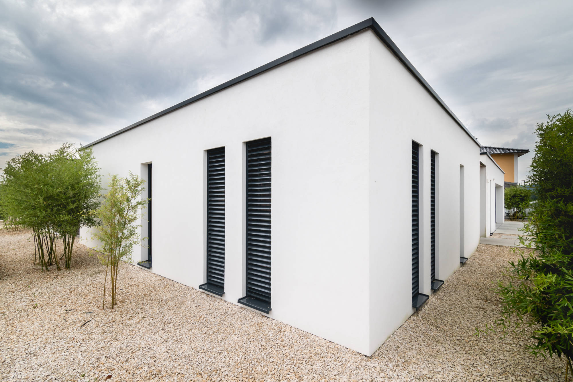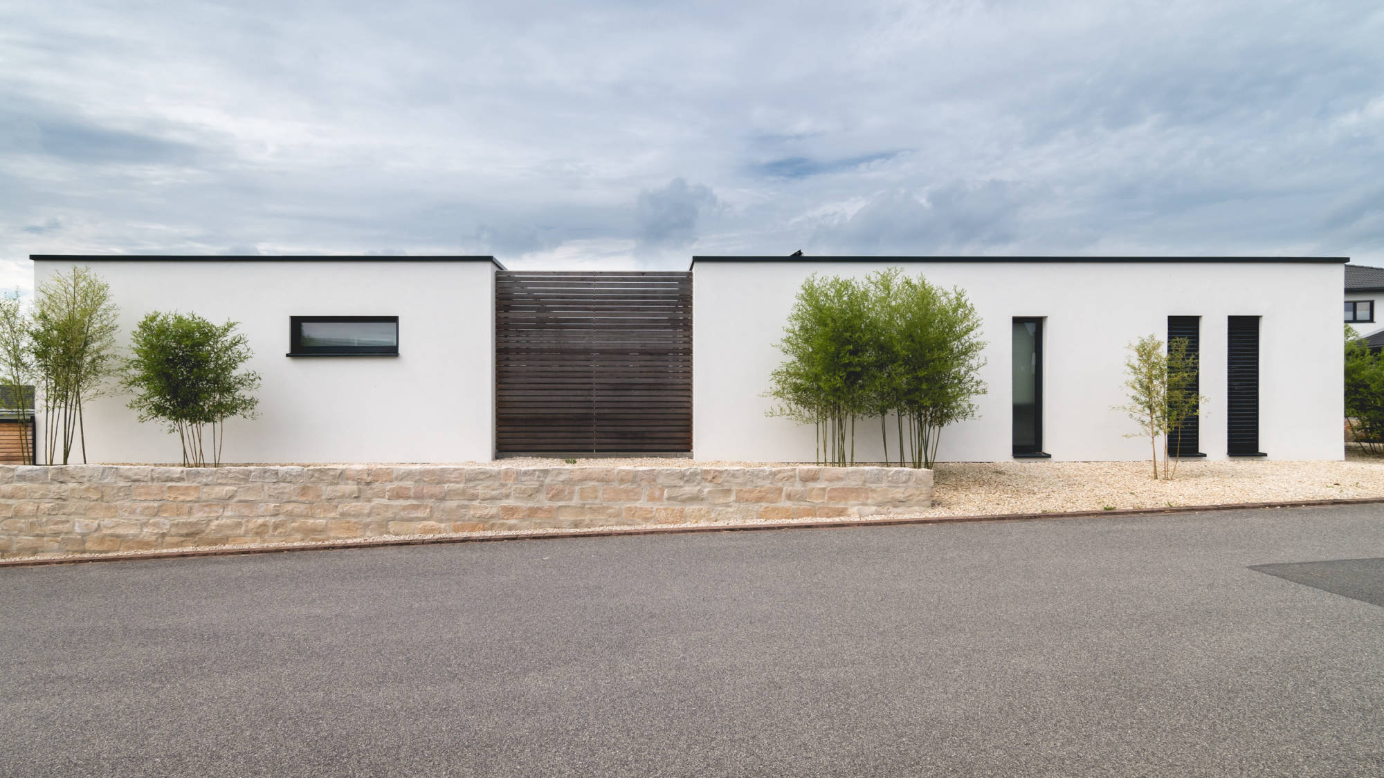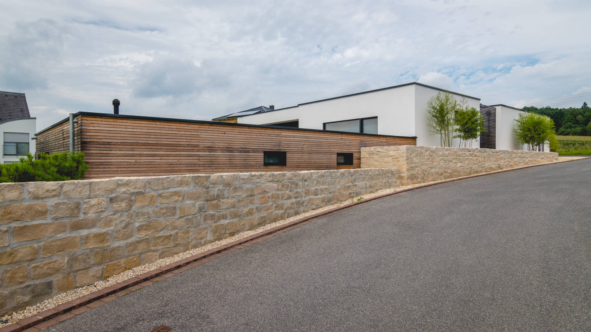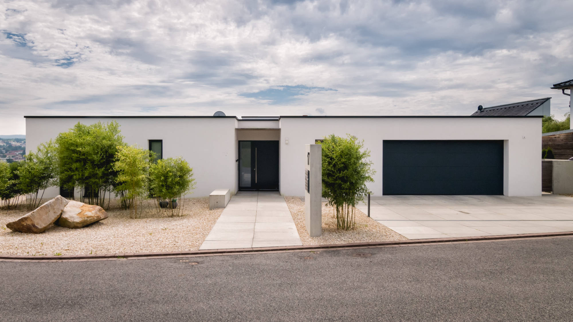 Der Bauherr wünschte auf zwei Grundstücken ein einfaches, aber edles Wohnhaus mit gut organisierten Funktionsbereichen, vom Büro, über den Kinderbereich mit eigener Loggia, bis hin zum großen Wohnen mit Ausblick in den Garten und ins Maintal.