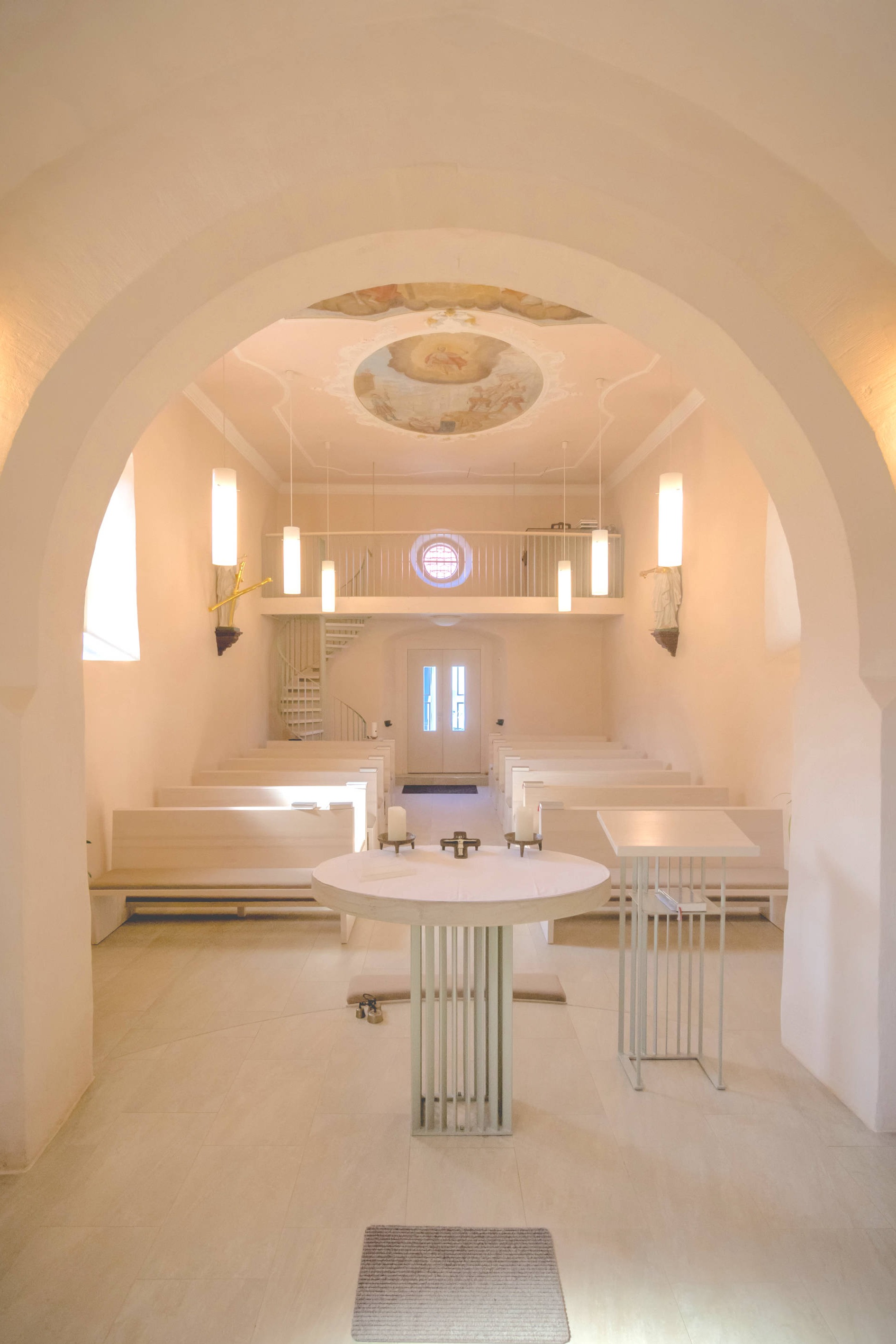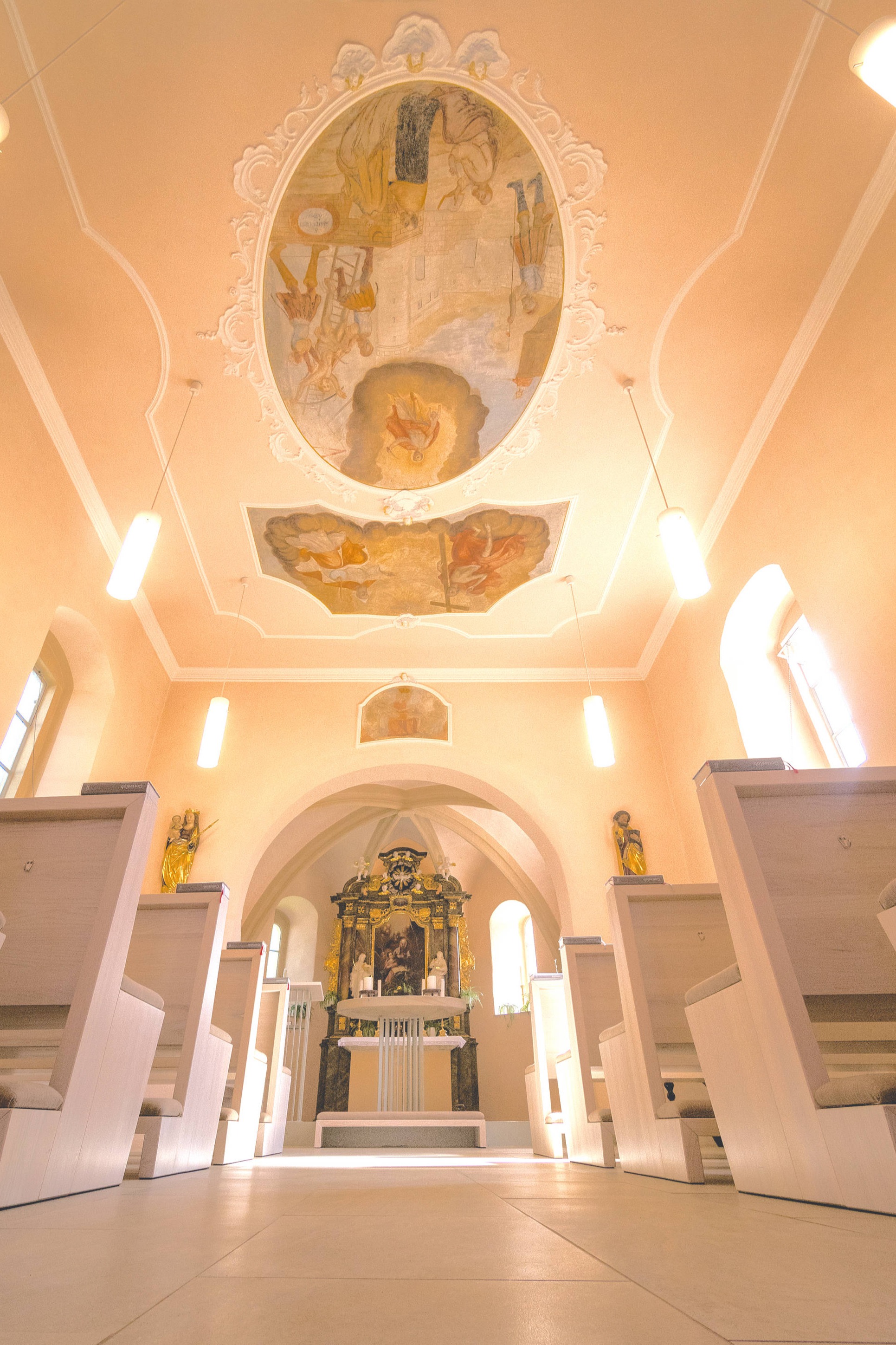 Aus der anfänglichen Kirchendachsanierung wurde nach Überprüfung der Schäden auch eine vollständige Sanierung. So wurde nicht nur das Dach, sondern auch die Bestuhlung und die Empore erneuert. Die alte Empore verdeckte das historische Deckenbild und durfte nach Abstimmung mit dem Denkmalschutz entnommen werden. Der Altarraum wurde angehoben, aus dem alten Nebenaltar die Sandsteinplatte weiter verwendet und ein neuer Volksaltar gebaut. Die Altarplatte scheint auf einem ganz dünnen Stahlgestell zu schweben. Die unzähligen Farbschichten wurden entfernt und der erste Wandanstrich wieder hergestellt. Die zarte Farb- und Lichtgestaltung hüllt die liebgewonnene Kapelle in ein weiches Licht.