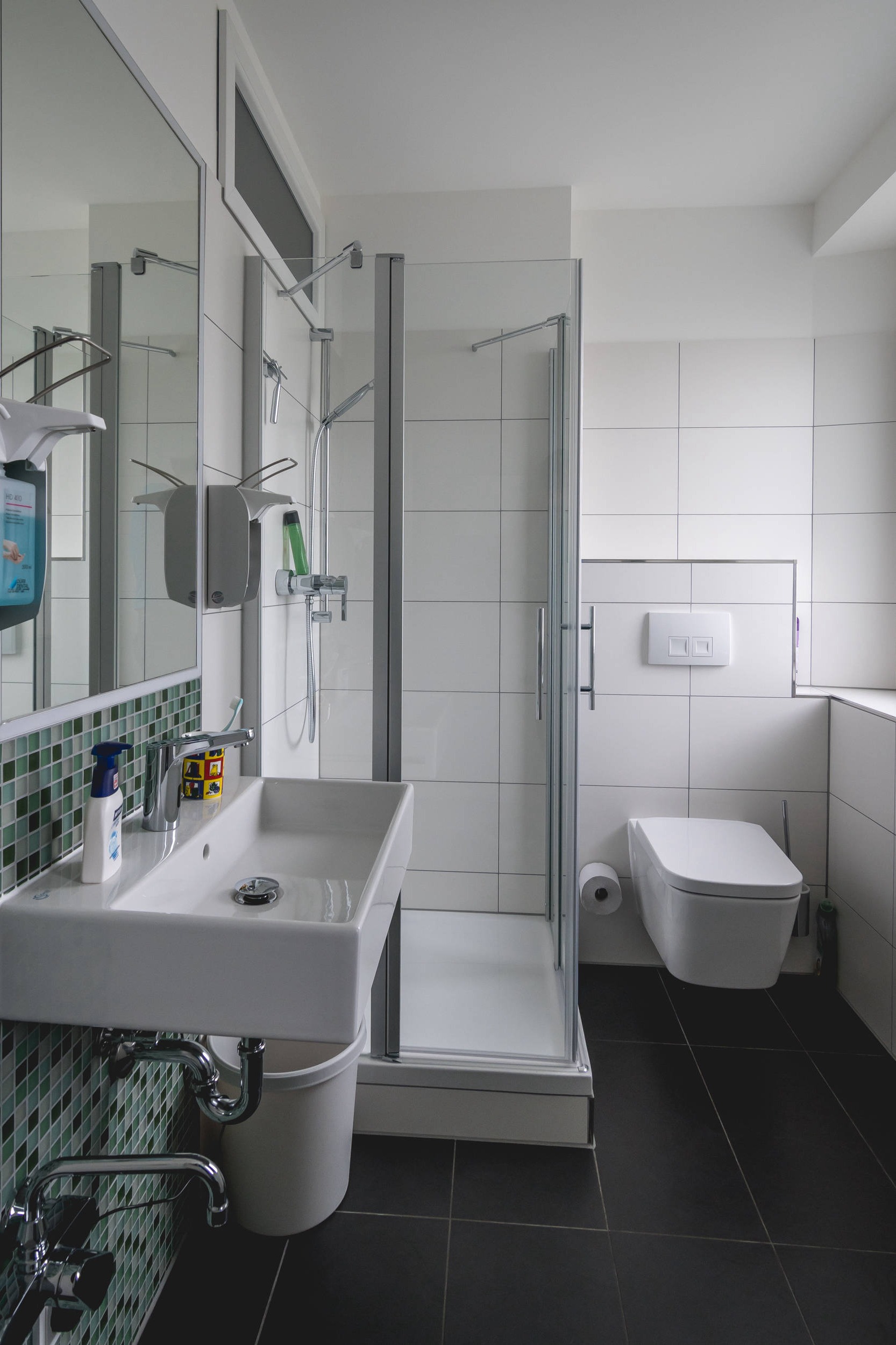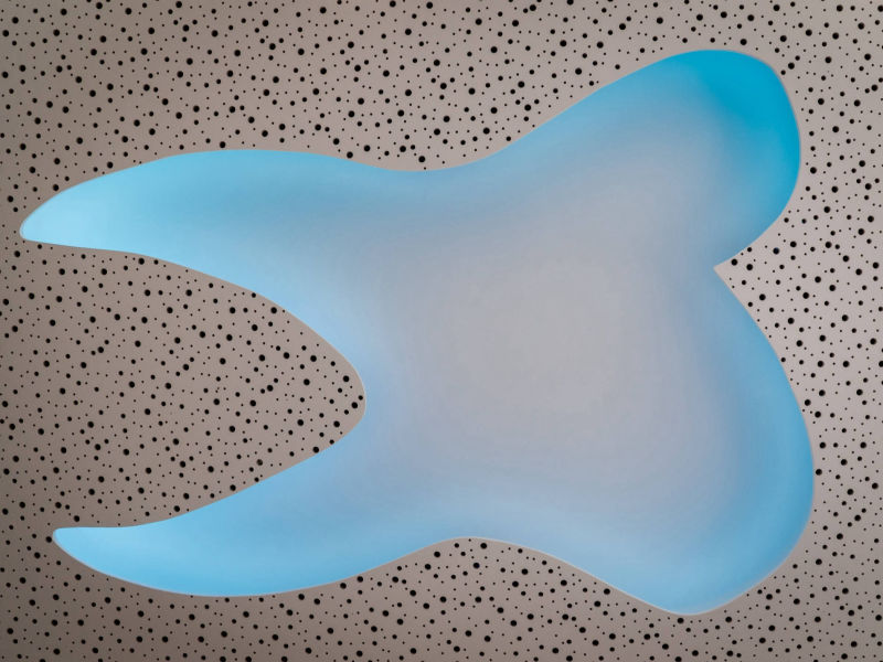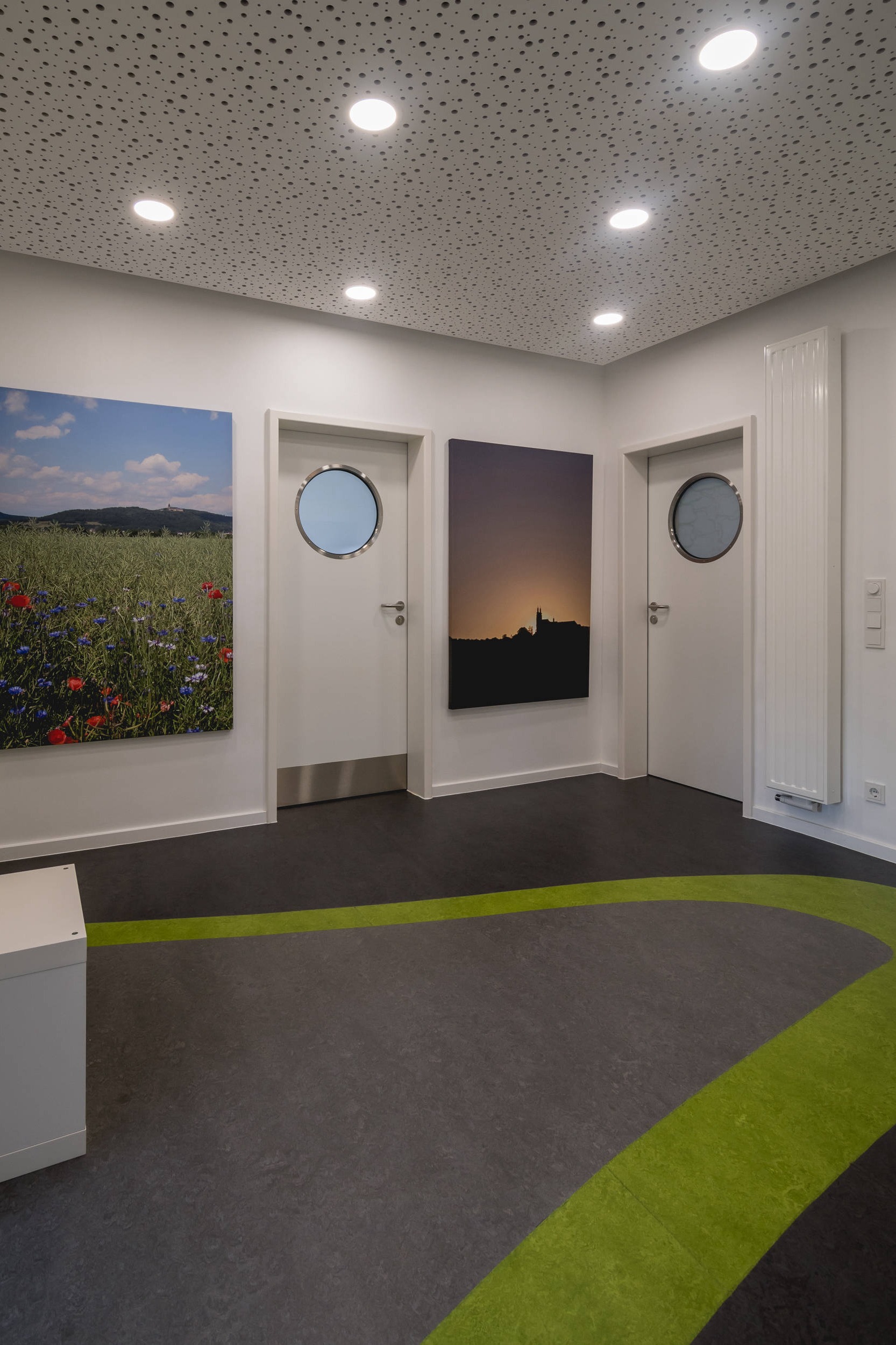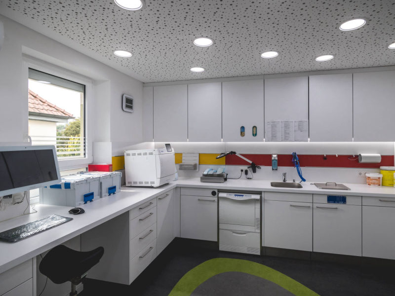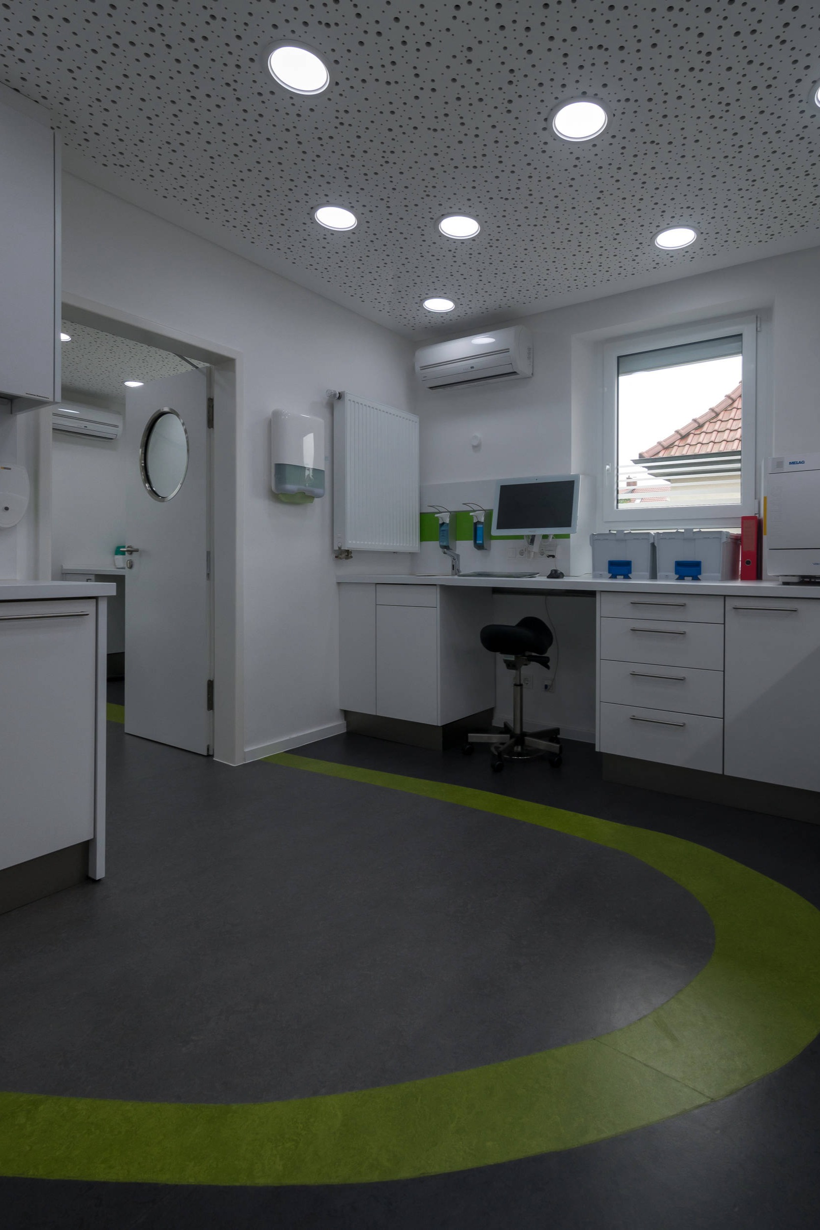 Die Räume sollten so hell wie möglich, aber so einfach wie nötig gehalten werden. Eine durch alle Räume stilisierte Zahnform am Boden leitet den Patienten durch die Abläufe des Obergeschosses. Für die Mitarbeiterbesprechung oder den Vortrag beleuchtet die Schallschutzdecke indirekt und nach Farbwahl den Raum.