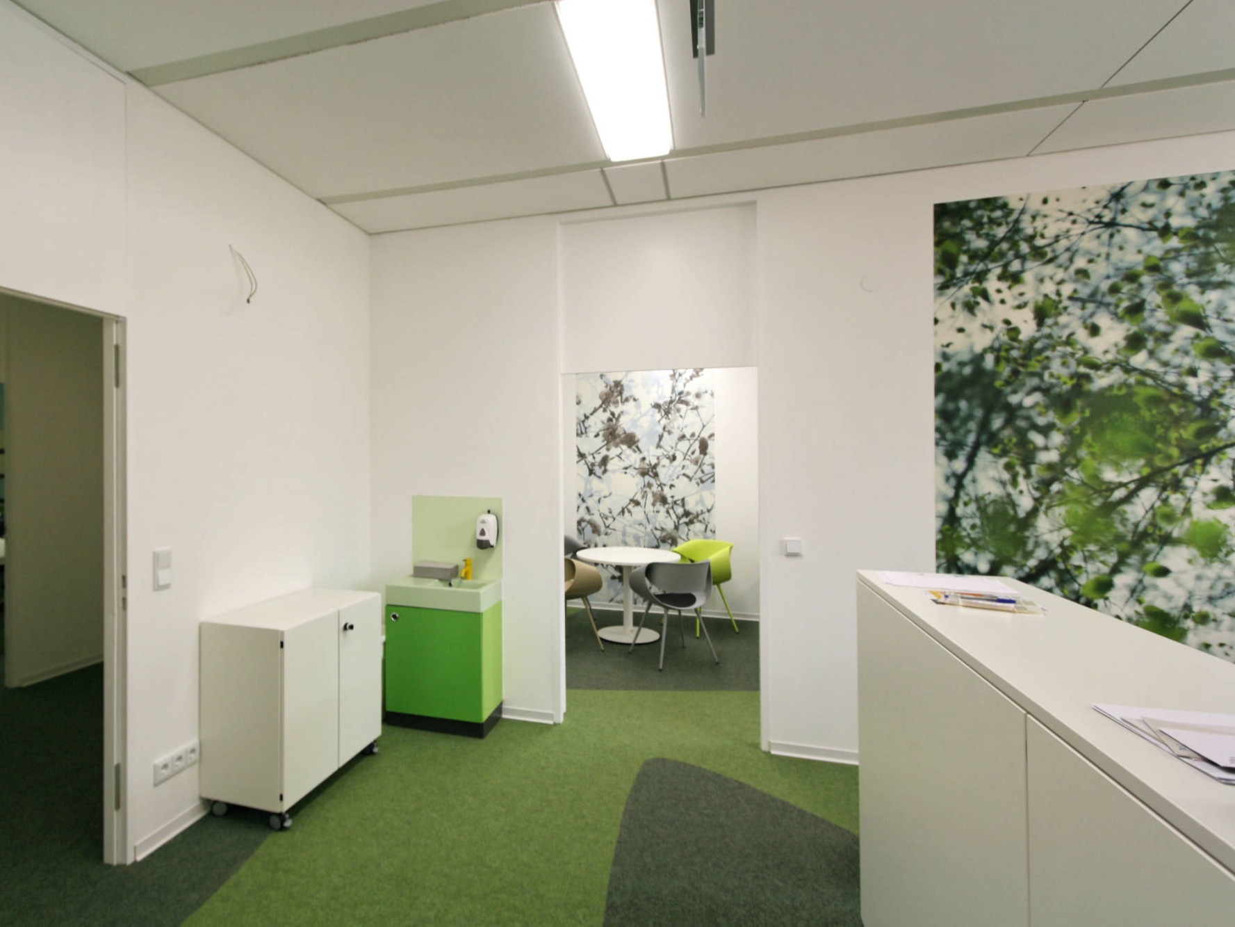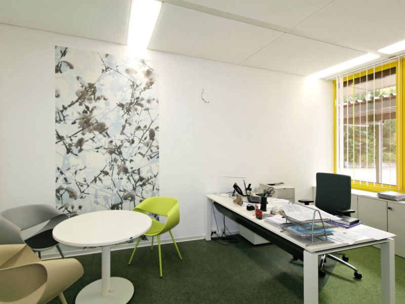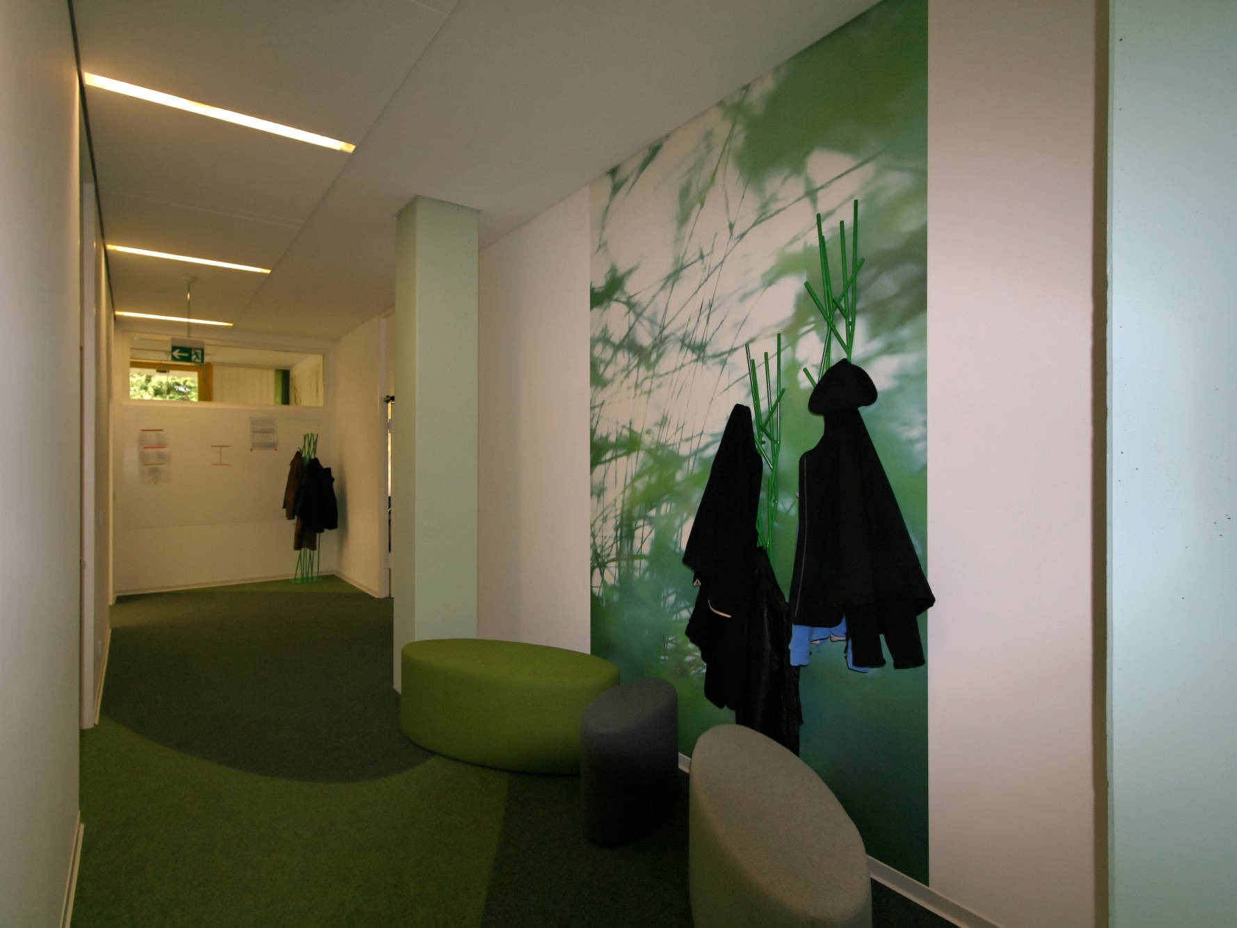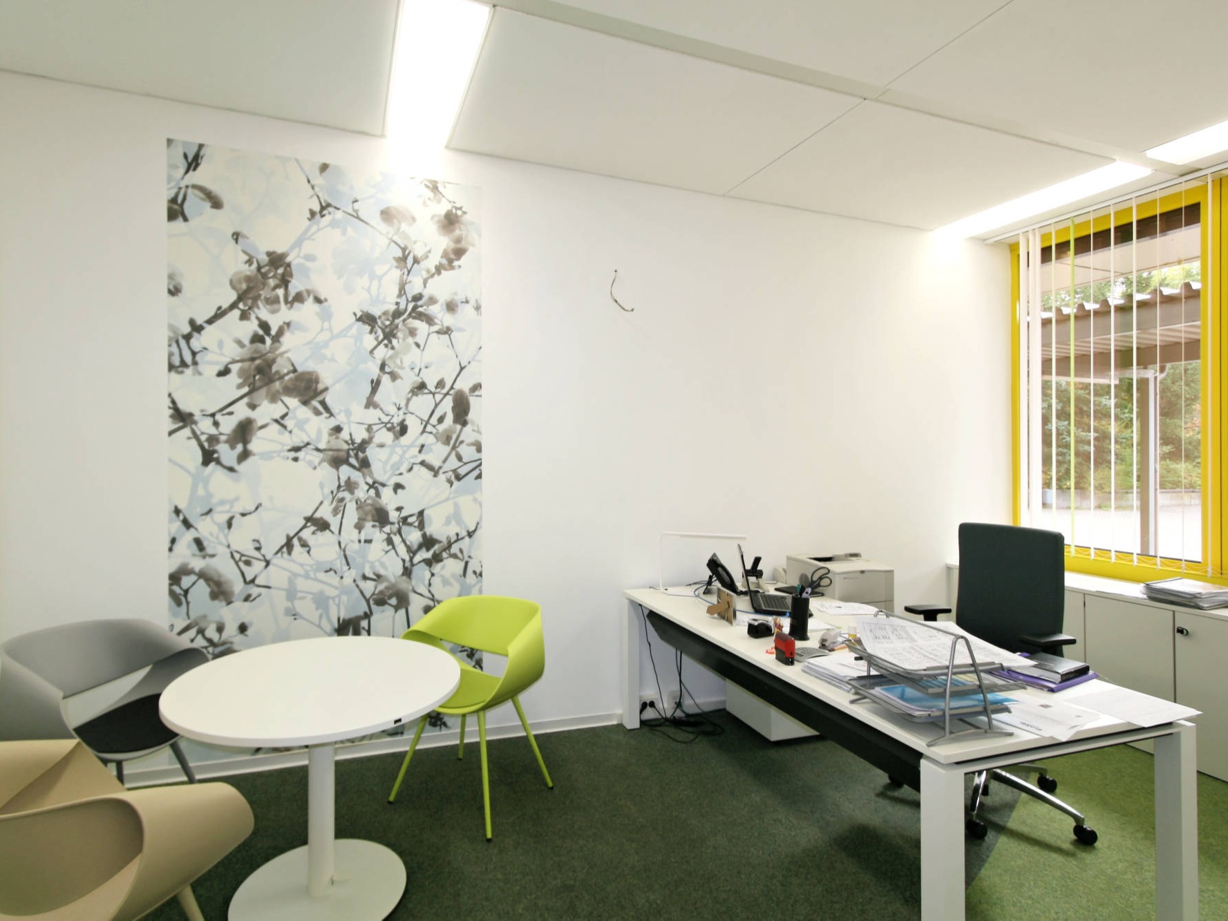 Mit natürlichen Formen und Farben wurde die Architektursprache aus den späten 70ern mit geringem Aufwand erneuert. Die Räume wurden mit geringem Budget und einer guten Auswahl moderner Möbel fit für die nächsten Jahre bis zur Generalsanierung gemacht.