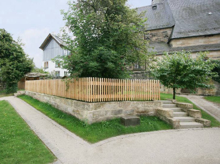 Die erste schräge Grasebene war für den Kerwabetrieb ungeeignet und sollte begradigt werden. Dafür wurde die Natursteinmauer saniert, zwei Treppen und ein einfacher Holzzaun, wie er in umgebenen Gartengrundstücken zu finden ist, errichtet.