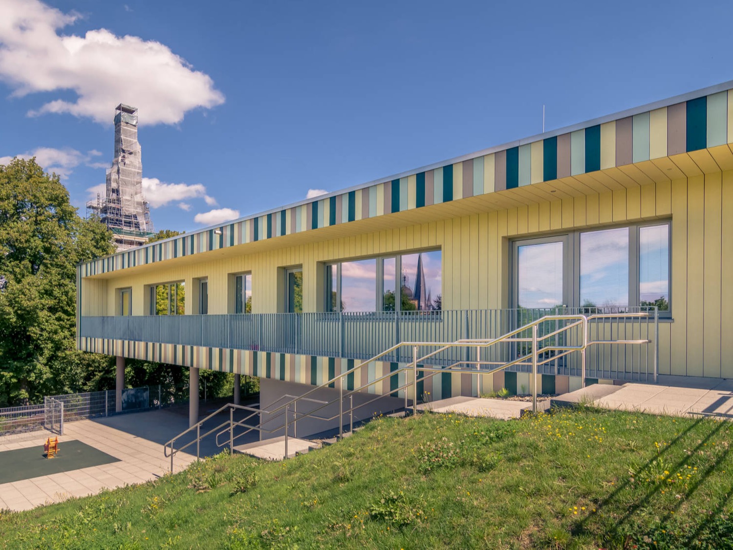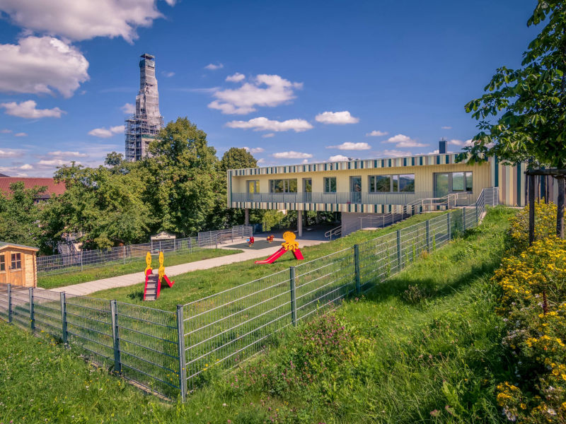 Die zunächst als zweigruppige Einrichtung geplante Kinderkrippe wurde kurz vor Einreichung des Bauantrags nach Überprüfung des Bedarfs in eine viergruppige Kinderkrippe hinter dem kath. Kindergarten entworfen. Dabei sollte nicht nur der Zugang zum Kindergarten, sondern auch der Schlittenhang im Winter und die natürliche Umgebung erhalten bleiben. Die Einrichtung wird über einen zentralen Flur erschlossen, rechts und links folgen die Gruppenräume, dazwischen je ein Bad, dahinter die Schlafräume. Durch die Hanglage des Obstbaumgrundstücks kragt das barrierefreie Erdgeschoss um 270 m2 auf wenigen Stützen aus und bildet so eine in Bayern einmalige UV-geschütze Außenspielfläche mit überdachten Sandkästen.