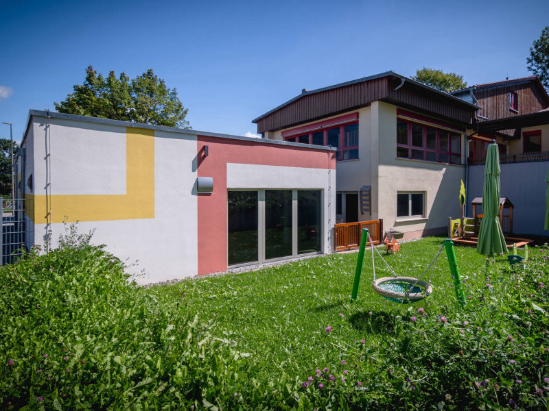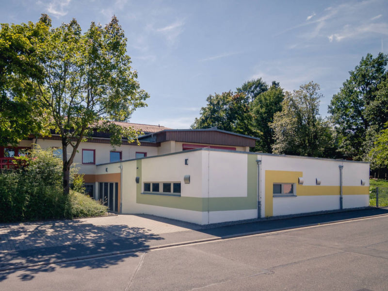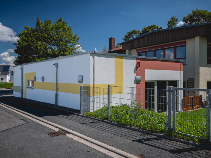 Nach der ersten Kinderkrippe in Altenkunstadt sollte auch am Kreuzberg-Kindergarten eine Krippe entstehen. Der stufenartig errichtete Kindergarten ermöglichte einen wirtschaftlichen Anbau lediglich im Vorgarten der im Untergeschoss angeordneten Wohnung - und wieder auf einem eigentlich nicht bebaubaren Grundstück.
