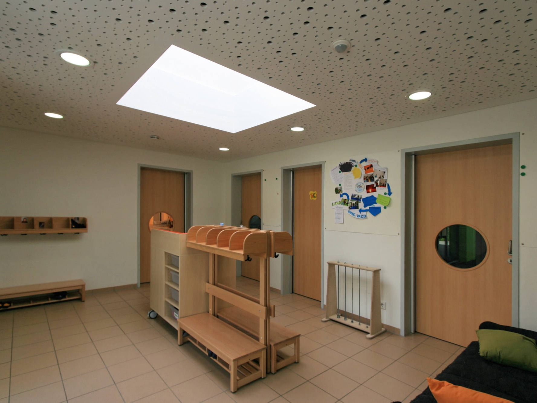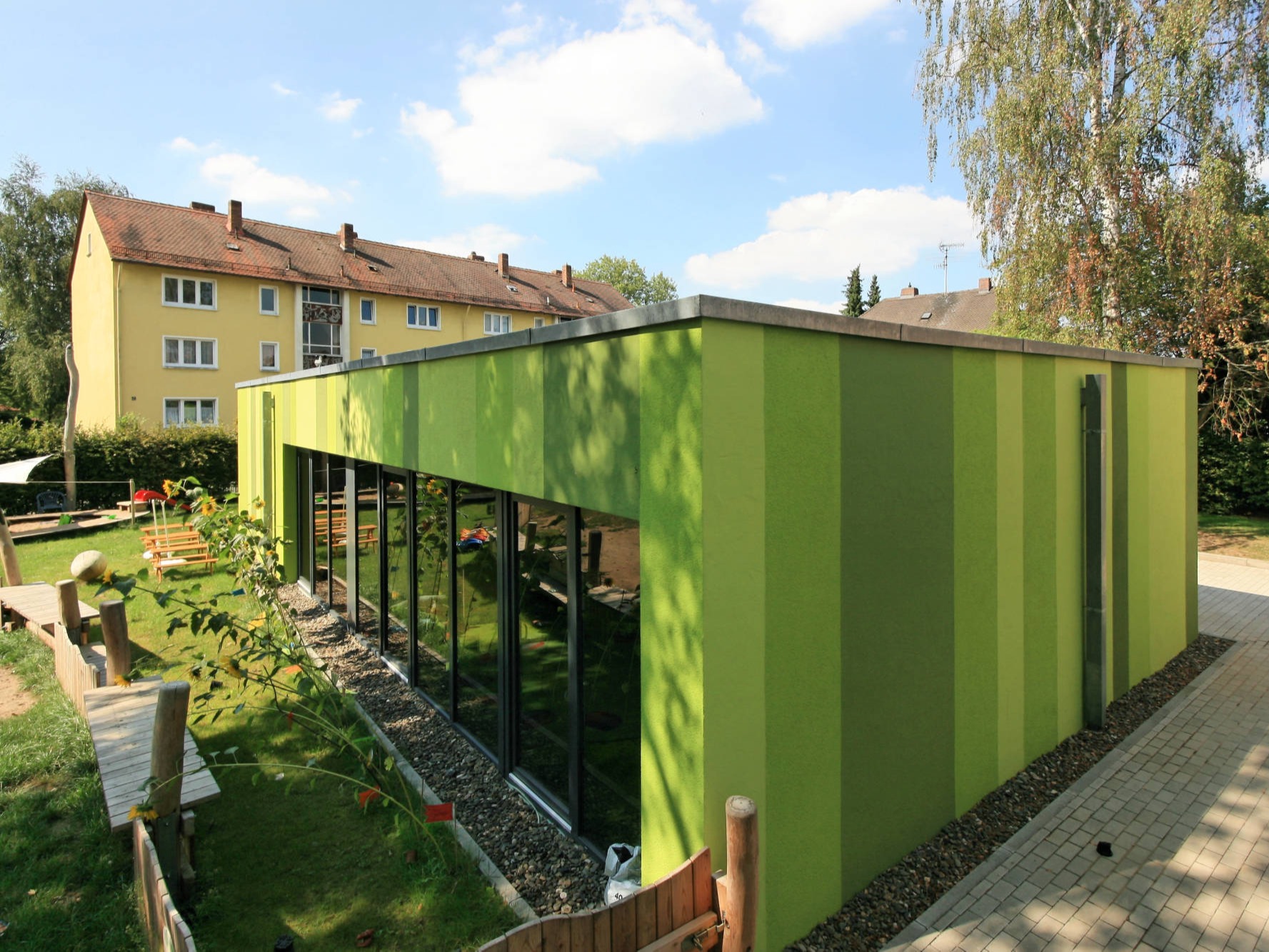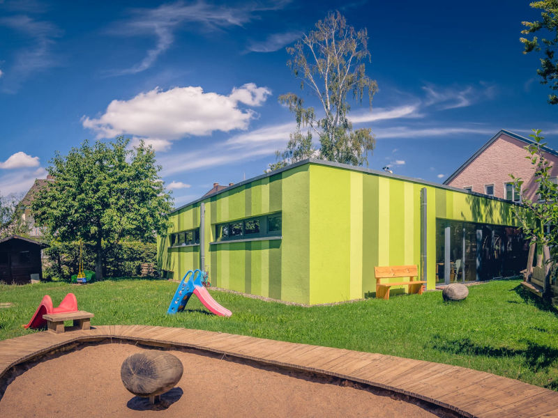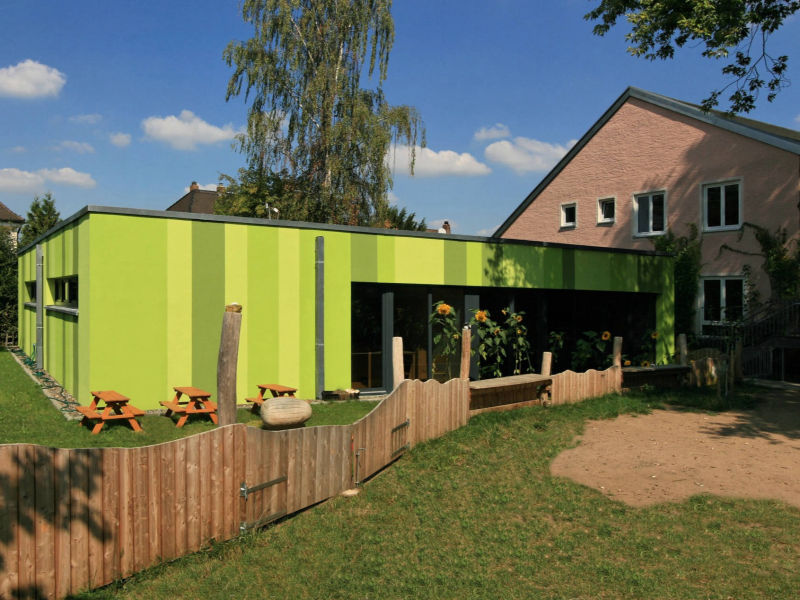 Im Spielgarten der zuletzt erweiterten Kindertagesstätte sollte eine eingruppige Kinderkrippe errichtet werden, ohne dass die nötige Außenspielfläche reduziert wird.
