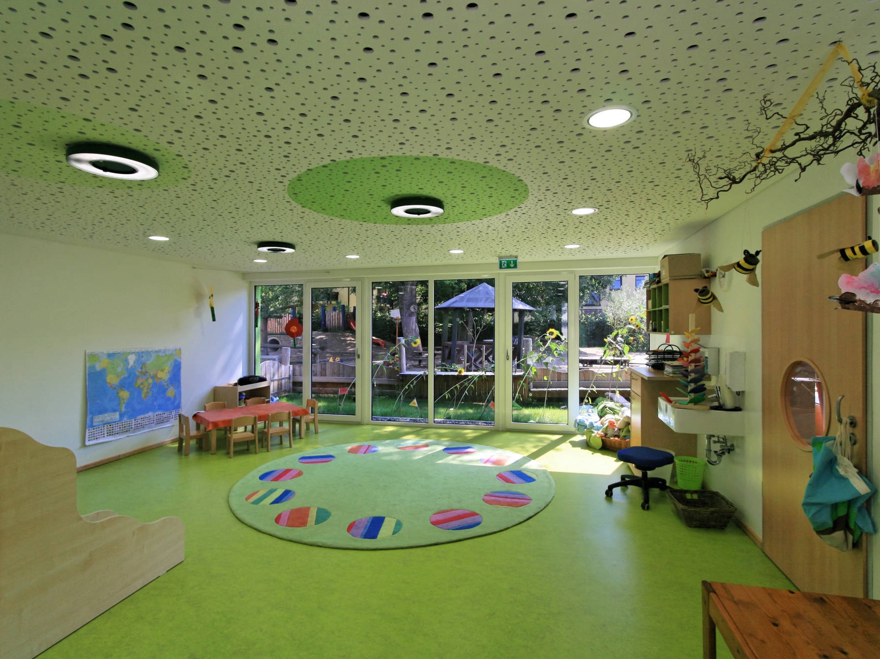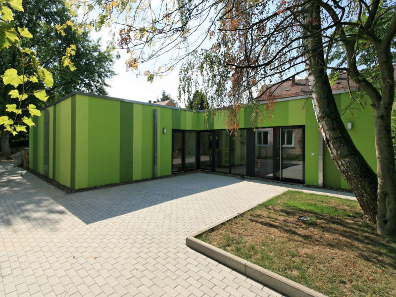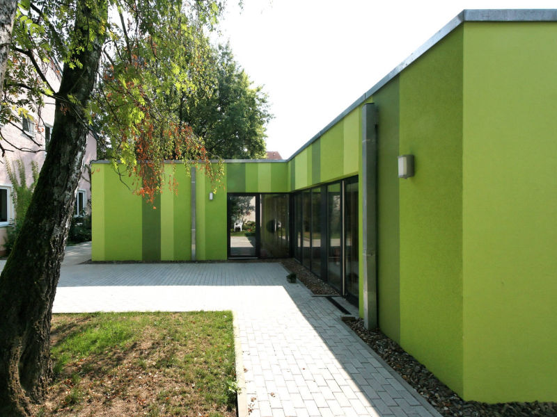 Nach Streit mit einer Nachbarin, die spielende Kinder als zu laut empfand, wurde der am Eingangsbereich geplante Anbau "ad acta" gelegt und ein Neubau mitten im grünen Spielgarten geplant. Umgebende Einblicke sehen die Farben des Gartens, die Kinder können jetzt mitten im Spielplatz in hellen schönen Räumen spielen und die Bauherren sind richtig glücklich über diese Lösung.