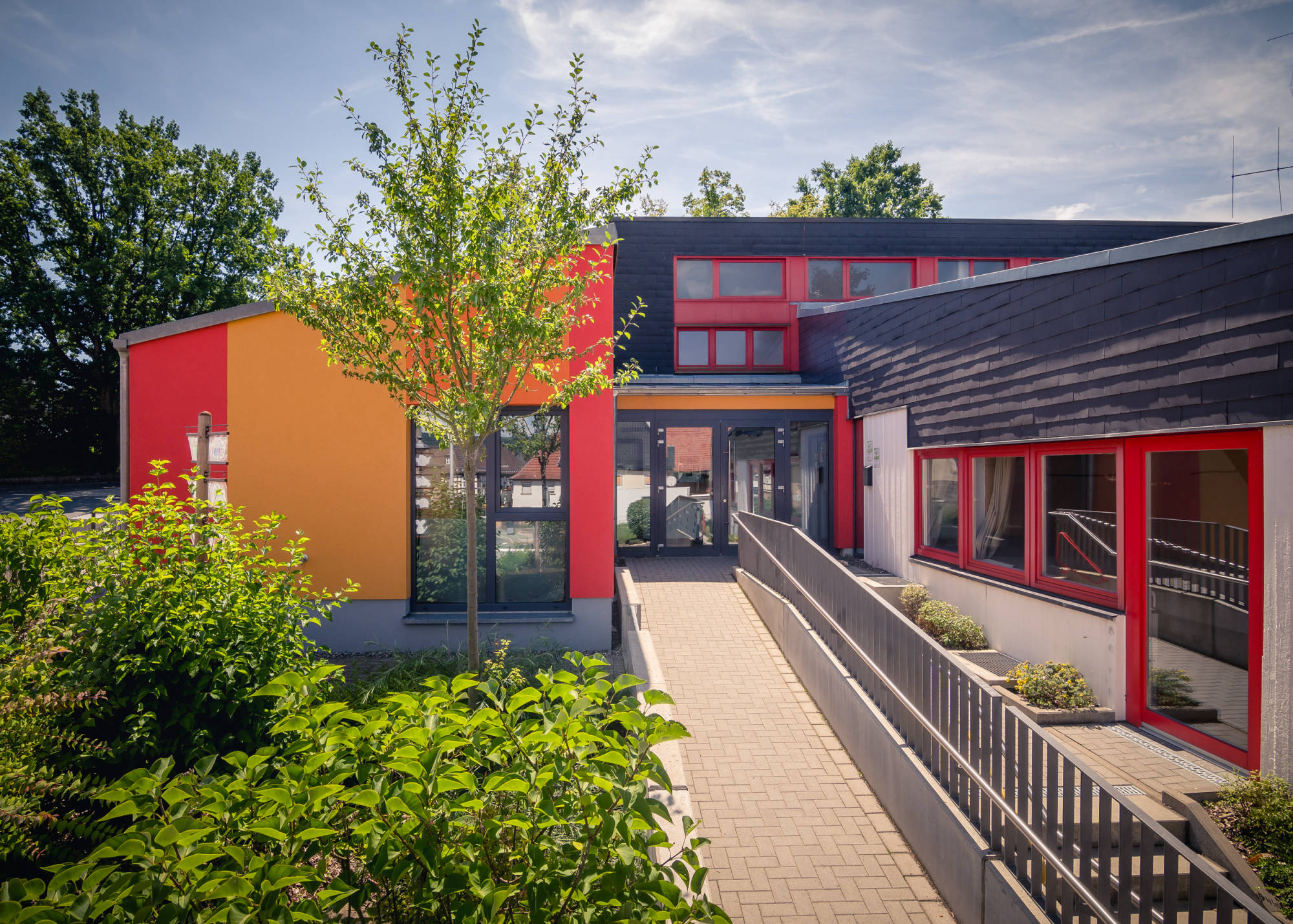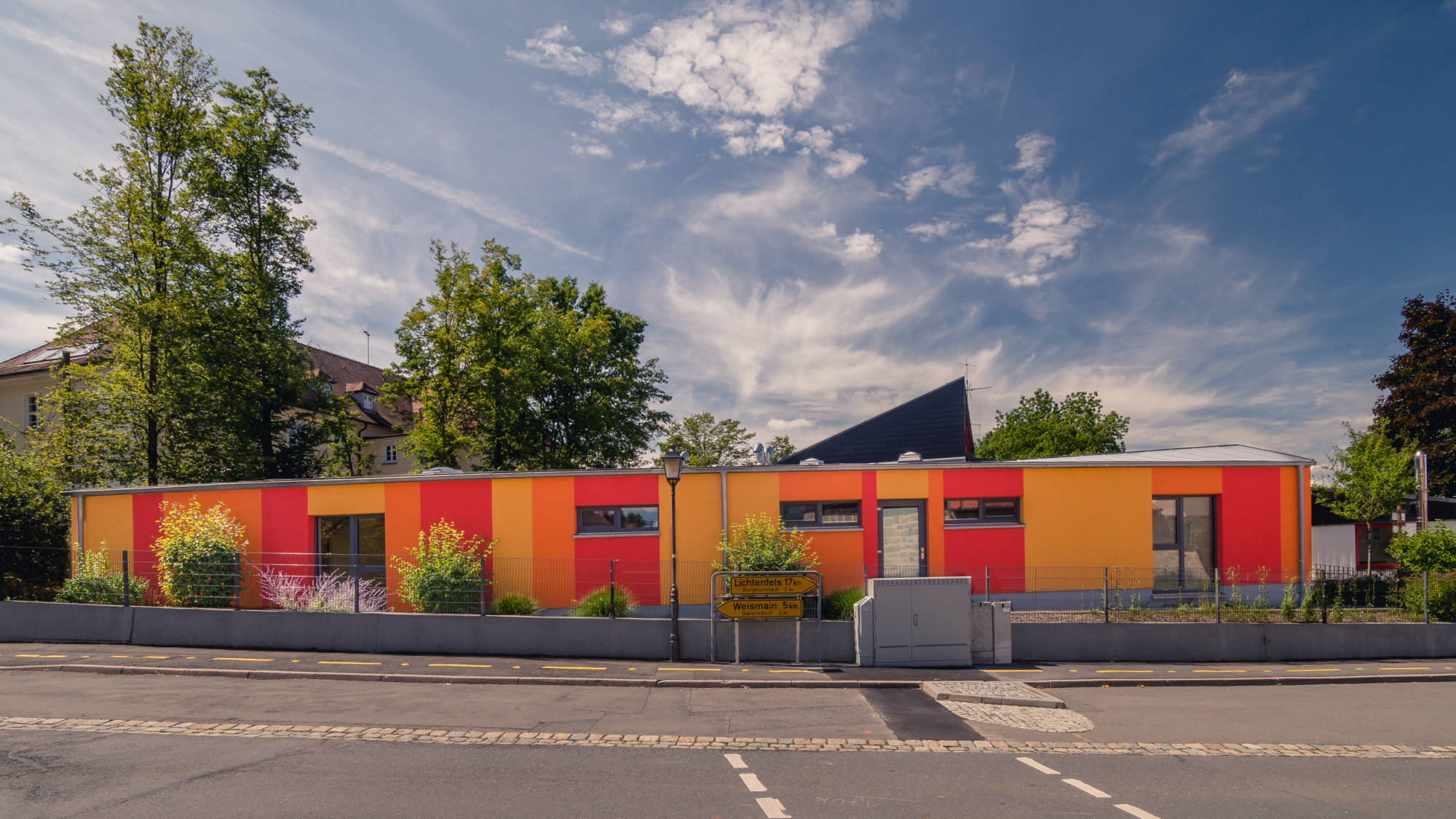 Der ehemalige Bürgermeister sah nicht ein, für eine Krippengruppe einen Kindergarten aufzugeben und im Spielgarten neu zu bauen. Auf einer als unbebaubar beschriebenen Grünfläche vor dem alten Kindergarten wurde das Raumprogramm der Regierung von Oberfranken optimal umgesetzt, sodass die maximale Fördermöglichkeit und die höchsten Raumflächen für zwei Krippengruppen entworfen werden konnten. Dazwischen enstand ein barrierefreier Eingang und dahinter ein kleiner, abgetrennter Spielgarten für die Krippenkinder.