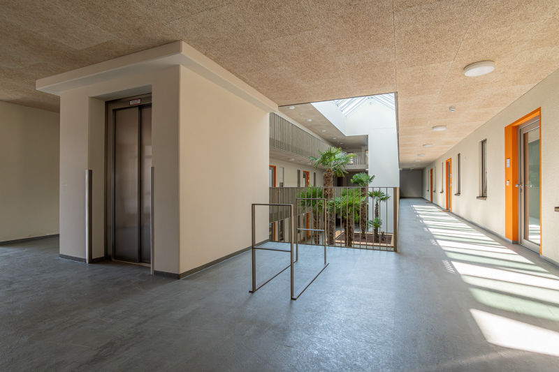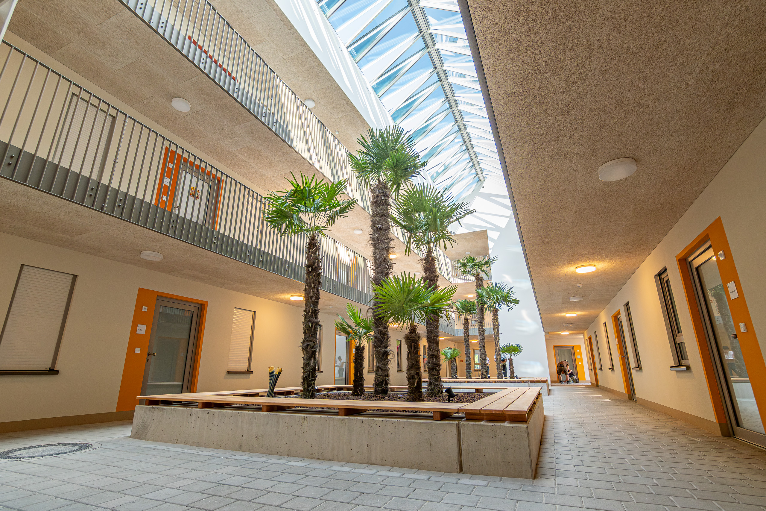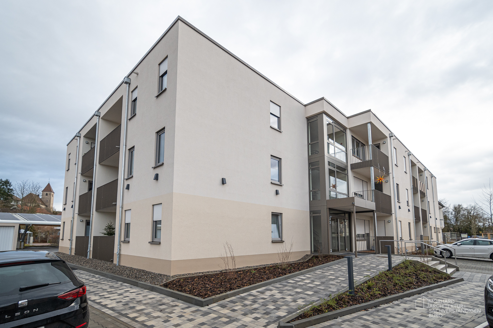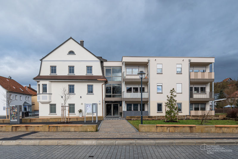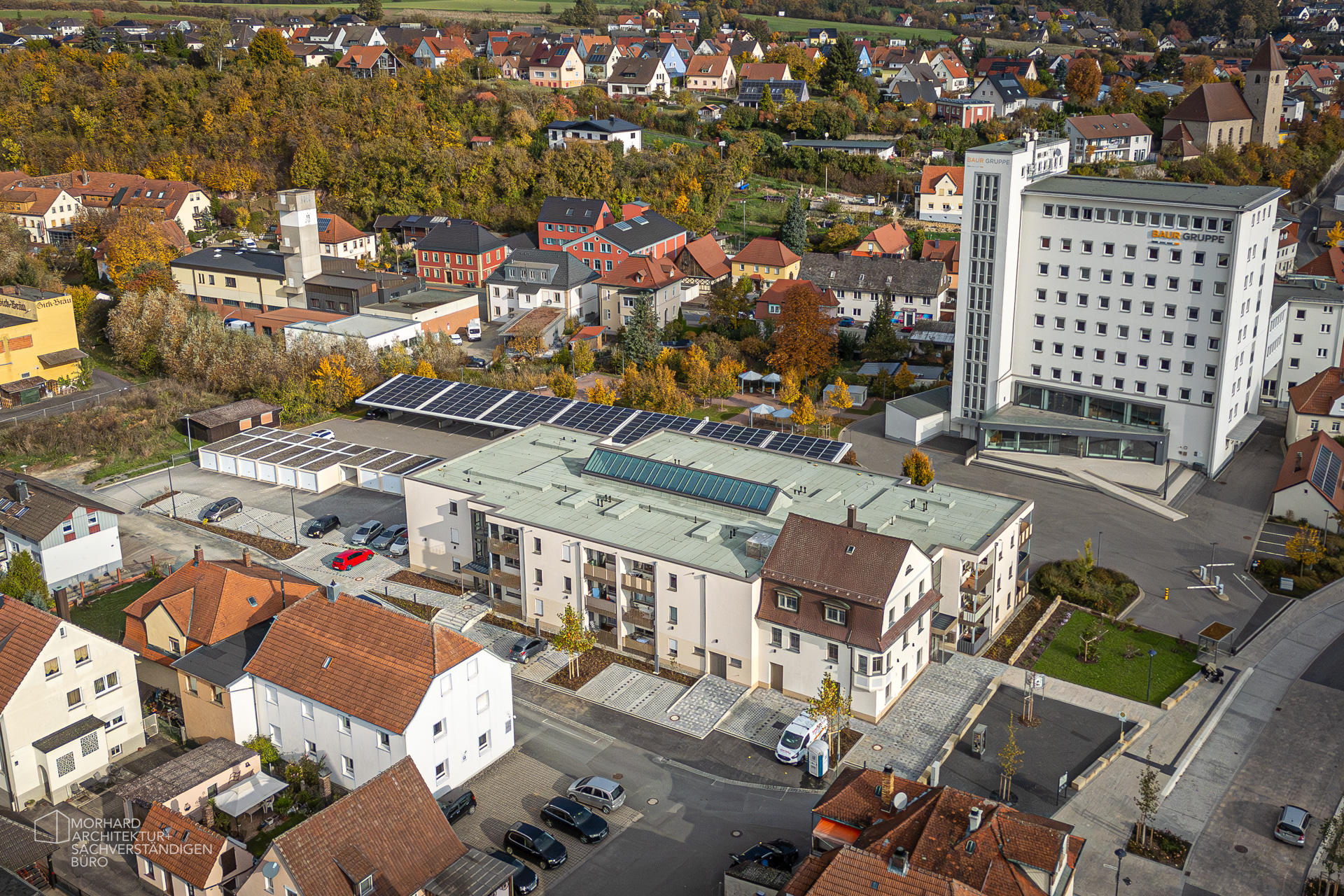 Das Hühnlein-Areal prägte die Entwicklung der Schuhproduktion in Burgkunstadt mit. Auf der Fläche ehemaliger Produktionsgebäude wurden alte Wohnungen aus den 70ern abgerissen, entsprechend Schadstoff entsorgt und ein Atrium mit 33 barrierefreien Wohnungen geplant. Anstelle offener Laubengänge können die Bewohner barrierefrei und wintersicher zu den Wohnungen gelangen. Die Wohnungen bieten jeweils 2-3 Bewohnern auf 45-65 m2 Platz. Loggien bieten den nötigen geschützten Aufenthalt im Freien.