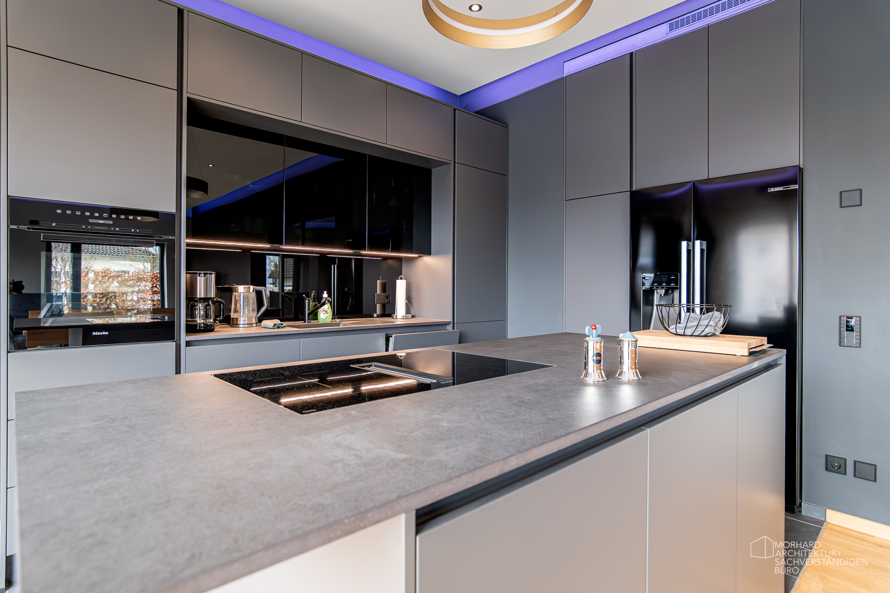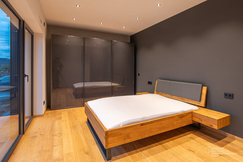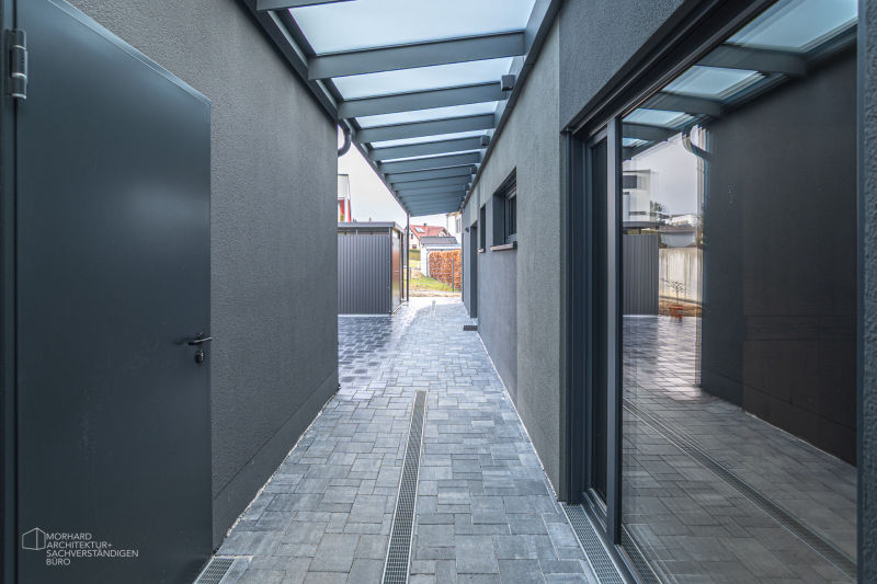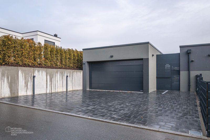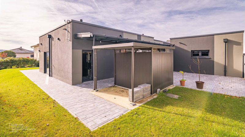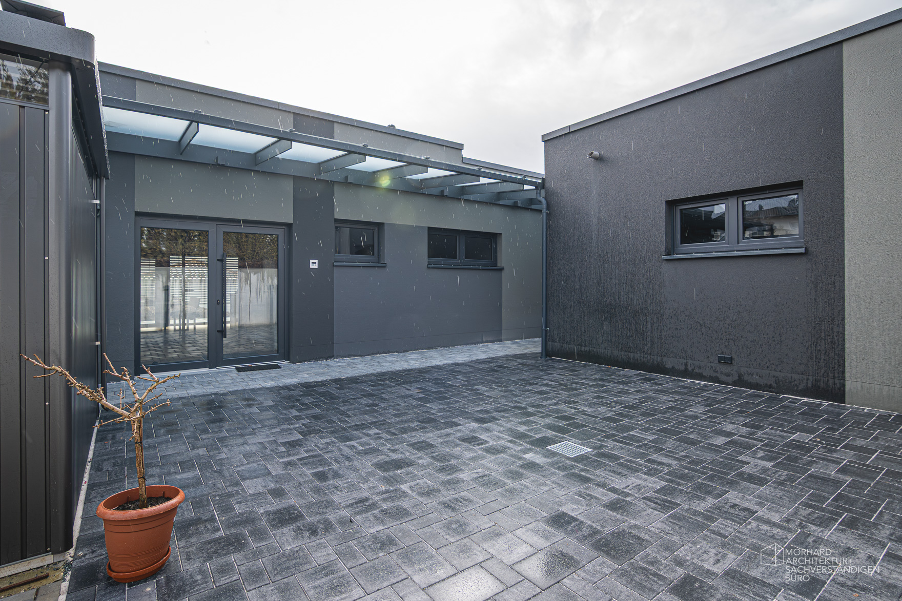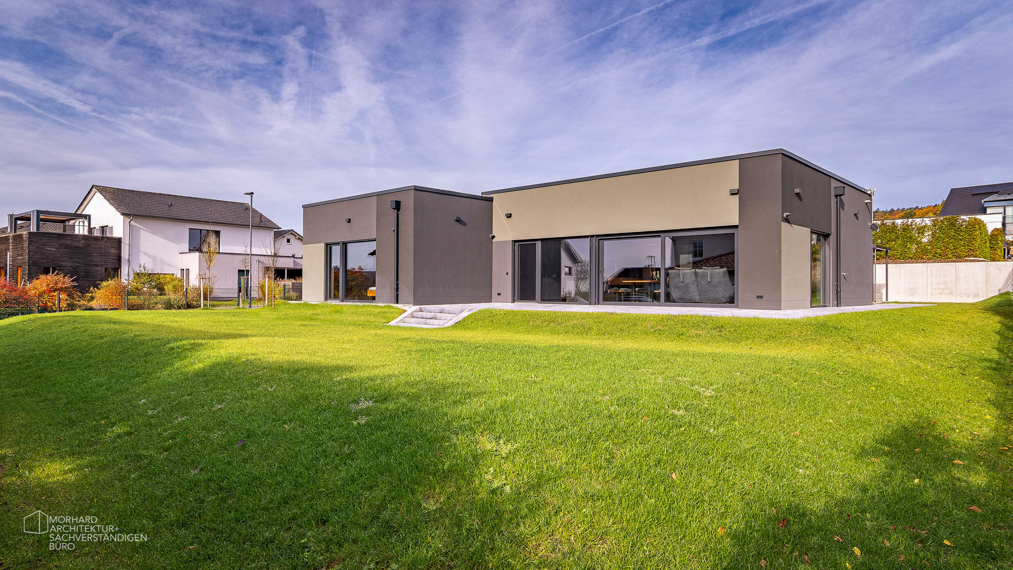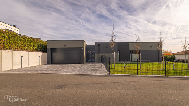 In einem mit hohem Anspruch bebauten Wohngebiet in einem Lichtenfelser Ortsteil wünschen sich die Bauherren ein erdgeschossiges Wohnhaus für drei Personen in kubischer Form mit Flachdach, welches aus der umliegenden Bebauung kaum Einblicke gewähren, jedoch von der Terrasse durch die Häuser in Hanglage die schönsten Orte des Landkreises, den Staffelberg, die Wallfahrtskirche Vierzehnheiligen und Schloss Banz sichtbar sein sollen. Das Bungalow mit grosser Garage, vorgesetztem Eingang soll offen eingerichtet werden. Zur Terrasse ist der Wohnraum vollverglast. Mit dunkeln Farbflächen soll sich das Haus gegenüber den Nachbarhäusern, umgeben von Naturgrün zurückhalten.